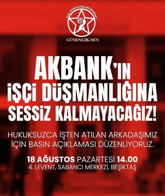 Bu karar; yalnızca bir işçinin değil, tüm özel güvenlik emekçilerinin örgütlenme hakkına, ekmeğine ve onuruna yönelmiş açık bir saldırıdır.Üyemiz, 2016 yılından işten çıkarıldığı güne kadar Tepe Savunma ve Güvenlik Hizmetleri A.Ş. ‘de taşeron olarak AKBANK şubelerinde çalışmaktaydı.2018’den itibaren ise Kozyatağı City’s AVM’deki AKBANK şubesinde görev yapmaktaydı. Yıllardır alın teriyle hizmet veren işçimizin, haklarını dile getirdiği için cezalandırılması, sermayenin ve taşeron düzenin gerçek yüzünü bir kez daha ortaya koymuştur.Sosyal medyada insanca yaşanacak bir ücret,kadrolu çalışma,sendikalı olma gibi en temel haklarını talep ettiği dile getirdiği için Sermaye sahipleri tarafından ekmeğinden edilmiştir.
